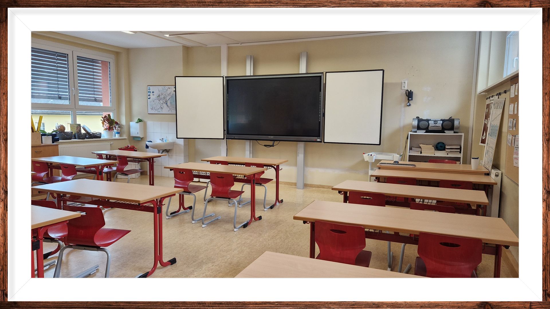 Unsere Schule besteht aus einem Kellergeschoss, dem Erdgeschoss sowie dem 1. und 2. Obergeschoss. Es gibt zehn helle, freundliche Räume, die als Klassen- bzw. Fachräume genutzt werden. In sechs Räumen sind hinter der altbekannten Kreidetafel auch digitale Anzeigegeräte installiert. Zwei weitere Räume verfügen über eine große interaktive Tafel.